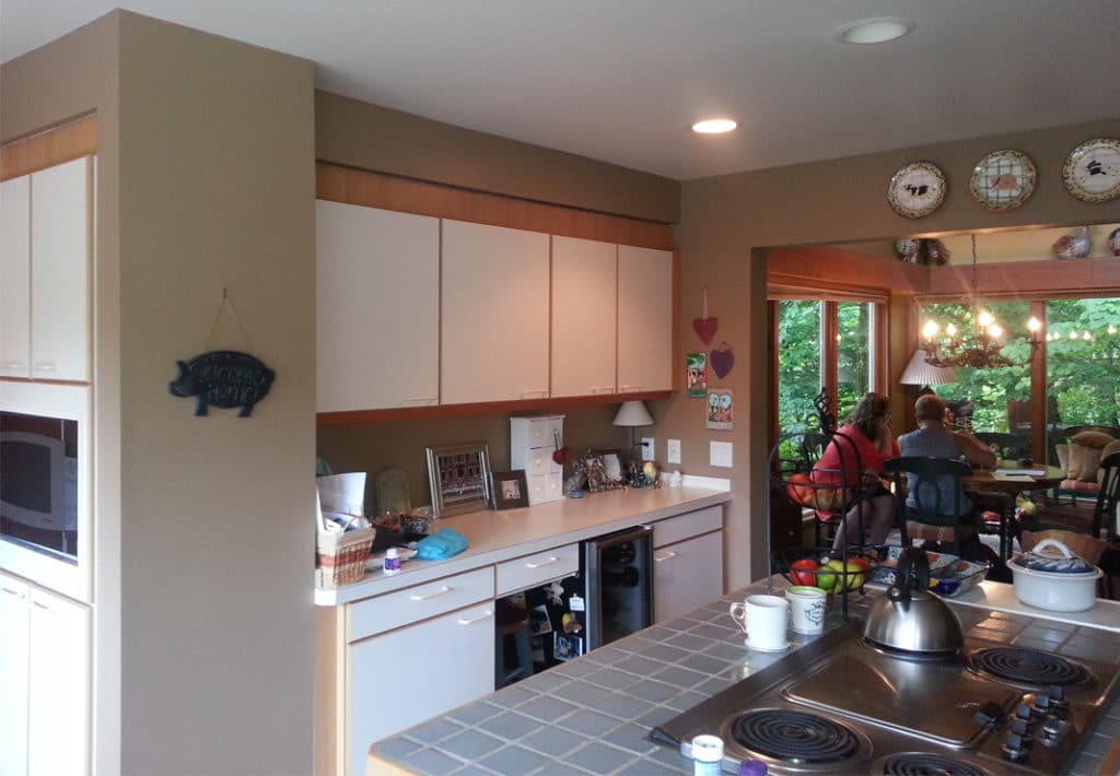 The old kitchen had seen better days and was very outdated with laminate cabinets and counters. We started the kitchen by removing floors, ceilings and soffits, and leveling the floors.